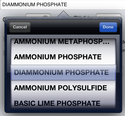 - If a mixed fertilizer, check the Mixed box and enter the N-P-K grade. Code will be set to 000. If Mixed is unchecked start entering a grade. If not, select the commodity from the selection wheel. You may wish to filter first (Dry,Liquid and/or N,P,K) You may also just type the code if known.